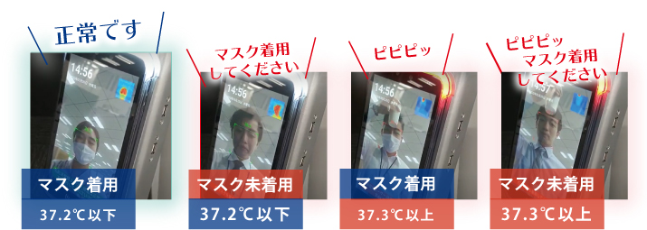 37.3℃以上の場合、音声と光でアラートが出ます。また、マスク未着用でアナウンスを流すことも可能でです。