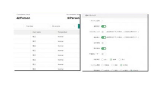 高性能サーモグラフィーで、温度測定は国内最速の約0.2秒。マスク着用時の温度測定や、未着用の場合はアラートを出す設定も可能です。