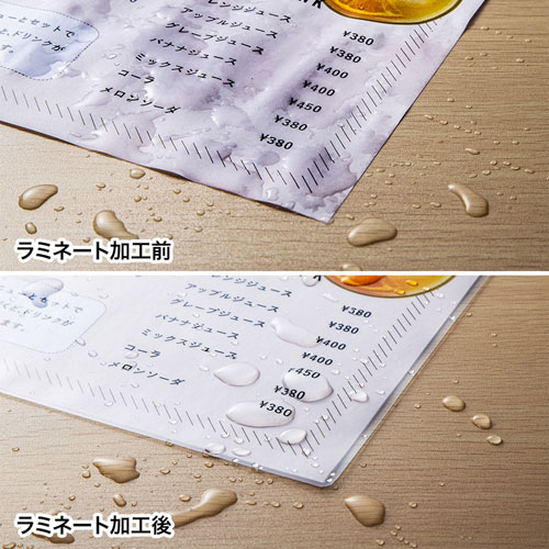 - 印刷物をラミネートすることによりキズや汚れを防ぎ、長く使用することができます。
