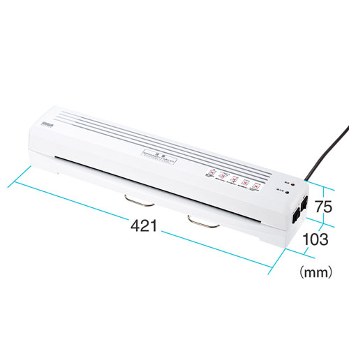 対応フィルム厚 75μm/100μm ラミネート速度 約260mm/分 ラミネート方式 ホットラミネート方式・コールドラミネート方式 ローラー本数 2本 最大ラミネート幅 340mm(A3サイズ) ウォームアップ時間 約3~5分 消費電力 400W 電源 AC100V 50/60Hz 電源コード長 1.2m サイズ W421×D103×H75mm 重量 1.55kg 付属品 フィルム受け、取扱説明書 ※本製品にラミネートフィルムは付属していません。75または100ミクロンの市販フィルムを別途お買い求めください。