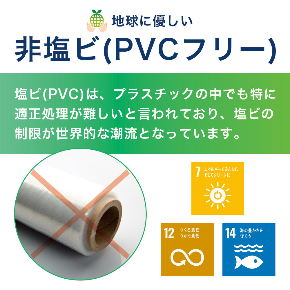 - PETのため、燃やしても有毒ガスがでず、地球にも優しい素材