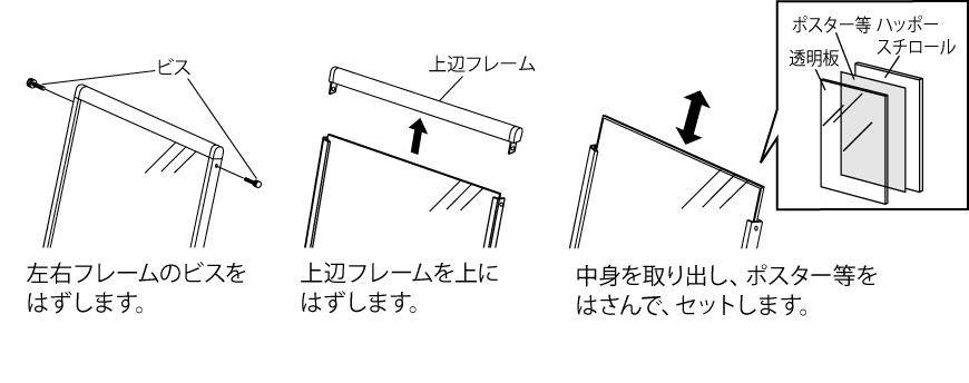 素材 フレーム:アルミ押出材 アルマイト仕上/コーナー:ナイロン/面板:1.5mm透明アクリル1枚、5mm発泡スチロール1枚