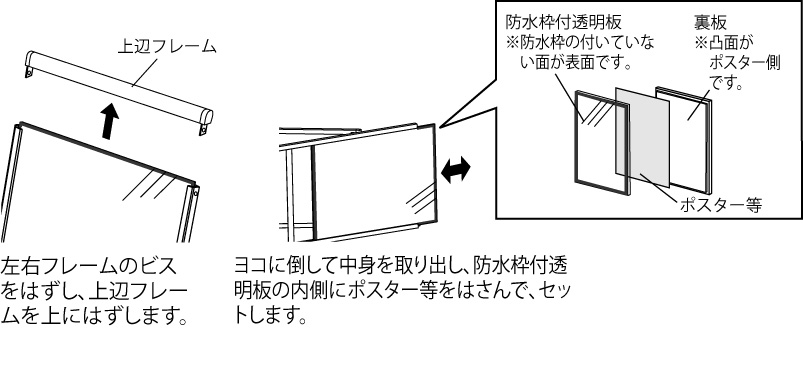素材 フレーム:アルミ押出材 アルマイト仕上/コーナー:ナイロン/面板:1.5mm透明アクリル防水枠付1枚、2mmプラダン+3mmアルミ複合板1枚