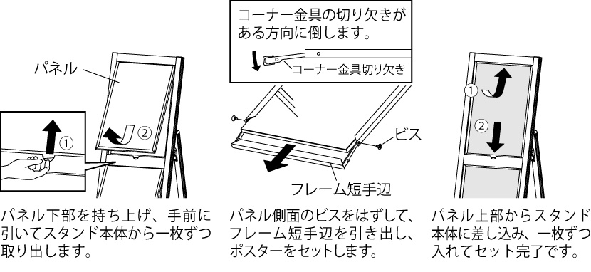 上下2段掲示のけんどん式ポスタースタンドです。6種のポスター表示替えが簡単に行えます。
