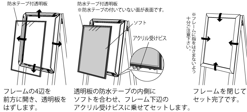 素材 フレーム:アルミ押出材 アルマイト仕上/面板:1.5mm透明アクリル防水テープ付 2枚、3mmアルミ複合板 2枚/脚部:アルミ押出材 アルマイト仕上