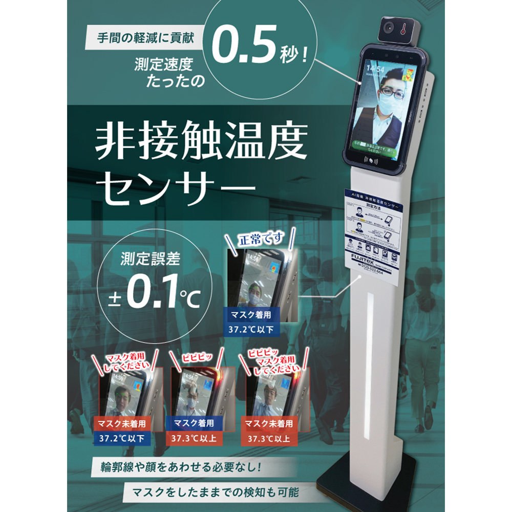 高性能サーモグラフィーで、温度測定は国内最速の約0.2秒。マスク着用時の温度測定や、未着用の場合はアラートを出す設定も可能です。