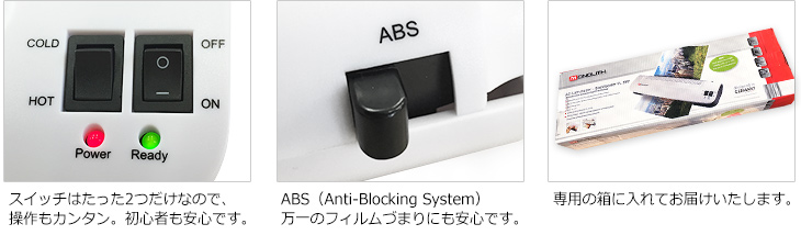 フィルムづまりを解消する、ABS機能スイッチで安心・安全です。